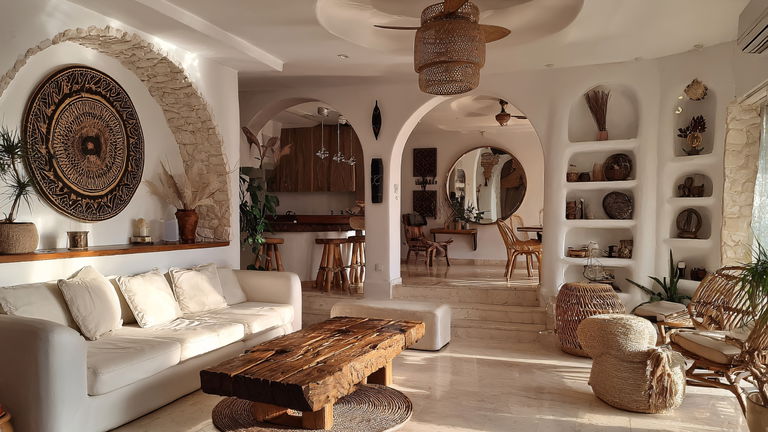 El mobiliario sigue líneas simples, pero con intención. No se trata de llenar el espacio, sino de elegir piezas que aporten armonía y equilibrio. Sofás de formas orgánicas, mesas de madera maciza, lámparas escultóricas y textiles de fibras naturales ayudan a construir un ambiente donde cada elemento tiene un propósito.