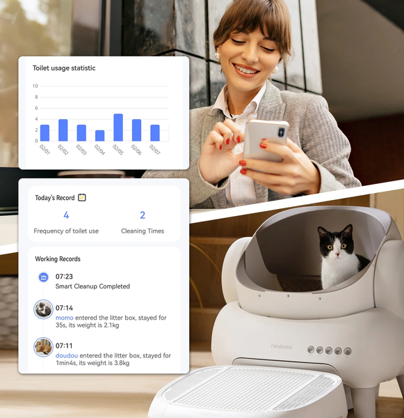 La parte más tecnológica llega con sus sensores inteligentes, que detectan la presencia del gato y detienen el funcionamiento si entra o se mueve durante el ciclo de limpieza. Una medida de seguridad imprescindible. Además, la app de Neakasa, compatible con Android e iOS, permite controlar el estado del arenero, seguir los hábitos de uso y gestionar funciones a distancia, algo especialmente útil en casas con más de un gato.